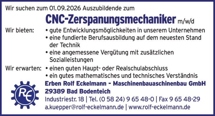 Anzeige | Offene StellenRolf Eckelmann – Maschinenbau GmbH CNC-Zerspanungsmechaniker:in Industrie, Werkstatt & Handel