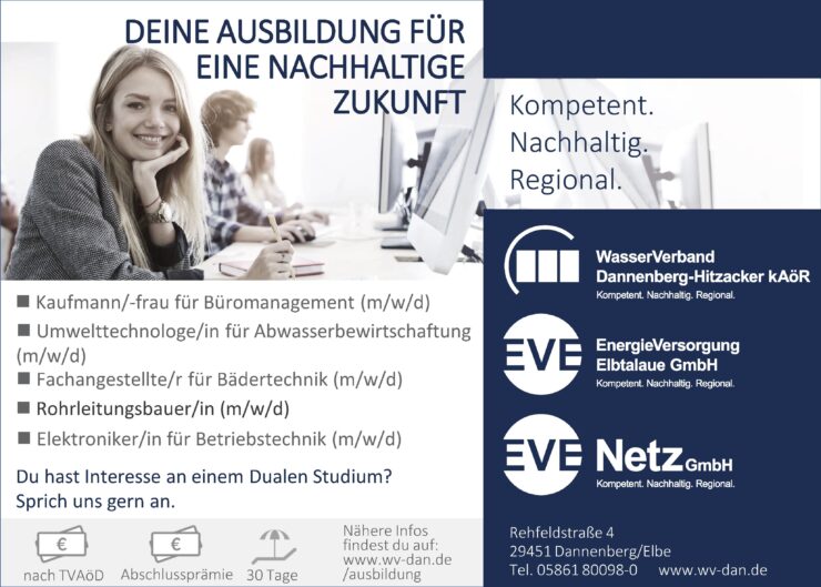 Anzeige | Offene StellenWasserverband EVE Büro & Dienstleistung Duales Studium Elektroniker:in für Betriebstechnik Kaufleute für Büromanagement Rohrleitungsbauer:in Umwelttechnolog:in für Abwasserbewirtschaftung