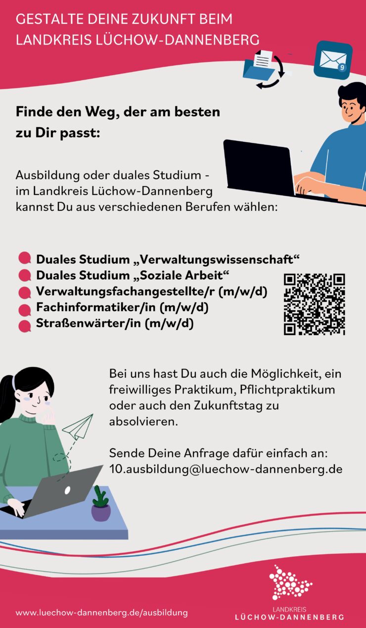 Anzeige | Offene StellenLandkreis Lüchow-Dannenberg Büro & Dienstleistung Duales Studium Soziale Arbeit Duales Studium Verwaltungswissenschaft Fachinformatiker:in für Systemintegration Praktika Soziale Arbeit (B. A.) Verwaltungsfachangestellte:r