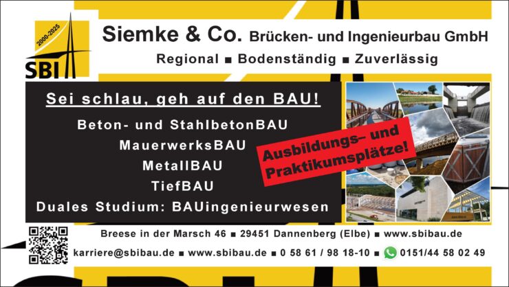 Anzeige | Offene StellenSBI Siemke & Co. Brücken- & Ingenieurbau GmbH Beton- und Stahlbetonbauer:in Duales Studium Bauingenieurwesen Handwerk & Tradition Mauerwerksbau Maurer:in Metallbauer:in Praktika