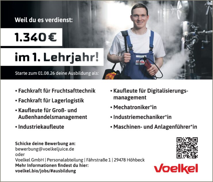 Anzeige | Offene StellenVoelkel GmbH Fachkraft für Fruchtsafttechnik Fachkraft für Lagerlogistik Industrie, Werkstatt & Handel Industriekaufleute Industriemechaniker:in Kaufleute für Digitalisierungsmanagement Kaufleute für Groß- und Außenhandelsmanagement Maschinen- und Anlagenführer Maschinen- und Anlagenführer:in Mechatroniker:in