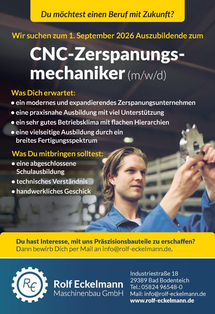 Anzeige | Offene StellenRolf Eckelmann – Maschinenbau GmbH CNC-Zerspanungsmechaniker:in Industrie, Werkstatt & Handel