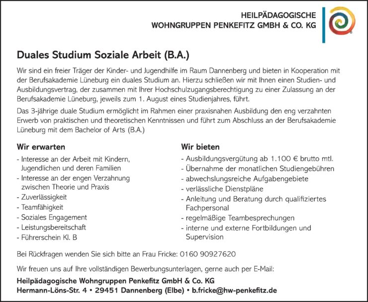 Anzeige | Offene StellenHeilpädagogische Wohngruppe Penkefitz GmbH & Co. KG Duales Studium Soziale Arbeit Gesundheit & Pflege