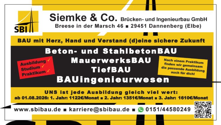 Anzeige | Offene StellenSBI Siemke & Co. Brücken- & Ingenieurbau GmbH Beton- und Stahlbetonbauer:in Duales Studium Bauingenieurwesen Handwerk & Tradition Mauerwerksbau Maurer:in Praktika Tiefbauer:in