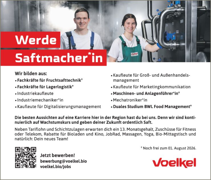 Anzeige | Offene StellenVoelkel GmbH Fachkraft für Fruchtsafttechnik Fachkraft für Lagerlogistik Industrie, Werkstatt & Handel Industriekaufleute Industriemechaniker:in Kaufleute für Digitalisierungsmanagement Kaufleute für Groß- und Außenhandelsmanagement Maschinen- und Anlagenführer Maschinen- und Anlagenführer:in Mechatroniker:in
